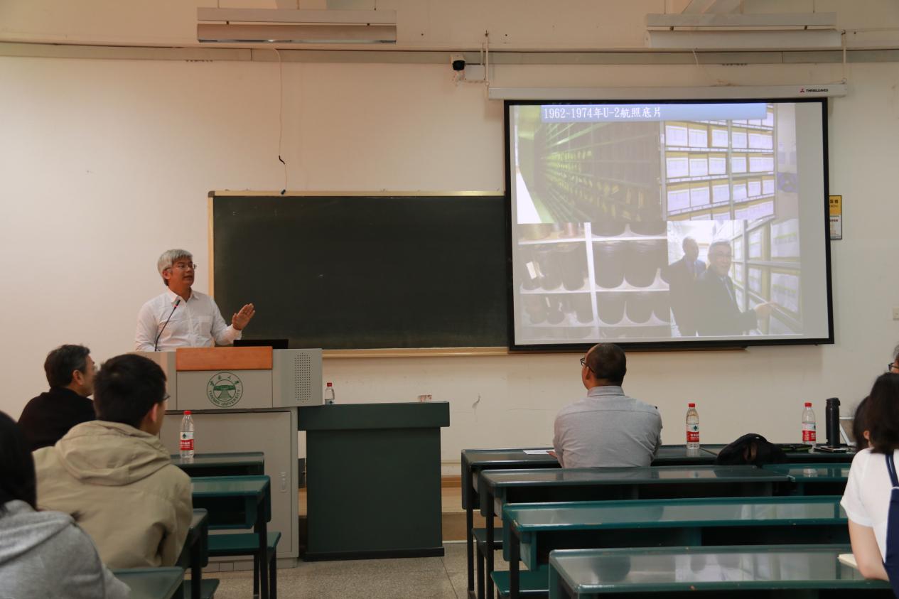 接下来,廖泫铭先生为现场师生介绍并展示了“航照数字典藏整合查询系统”。该系统以抗日战争末期,美国陆军第十四航空队陈纳德将军建议合作航测绘制我国西南九省地图,并于1944年6月成立“中美合作航空测量队”为历史背景,收集了1943至1976年台湾旧航照影像数据。同时,廖泫铭先生简要介绍了“日本外邦图研究会”、“美国德州大学地图数字典藏”“美国哈佛大学地图数字典藏”“David Rumsey Map Collection”等几个国际著名的东亚地图资源数据库,并以“百年历史地图系统”为例,向现场师生演示了地理信息数字典藏的加值应用。