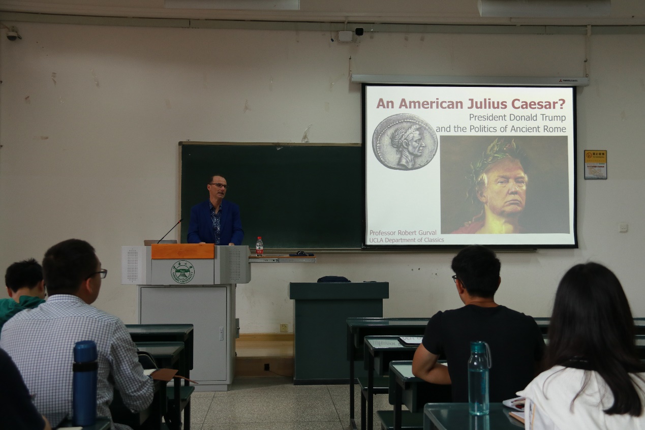 2018年5月30日14:30,新葡萄官网AMG邀请了加州大学伯克利分校古典学博士、加州大学洛杉矶分校古典学系教授、富布赖特学者罗伯特•古瓦尔(Robert Gurval),为新葡萄官网AMG师生们做了题为“美国的恺撒?——唐纳德·特朗普总统与古罗马政治”的学术报告。新葡萄官网AMG副院长罗群教授担任本次讲座的主持人。