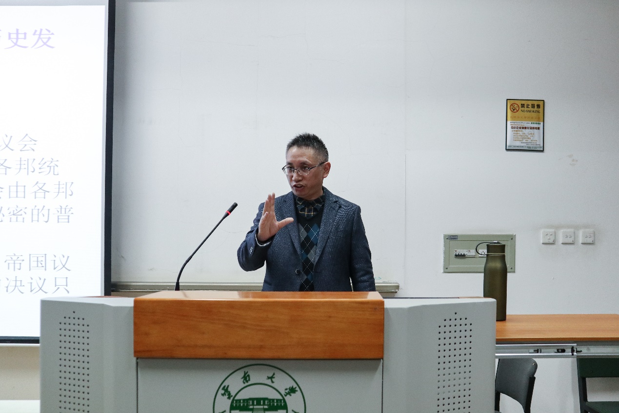 讲座伊始,钱金飞教授简要回顾了中世纪以来德意志先后经历了第一帝国、德意志邦联、德意志第二帝国、魏玛共和国、德意志第三帝国、盟国管制时代、德意志联邦共和国与德意志民主共和国并立,最终于1990年再统一的历史的发展脉络。接着,钱金飞教授指出了“德意志特殊道路”就是学术界用来解释和说明19世纪以来德国历史发展的一种理论;而“德意志特殊道路”的概念是在19世纪初期德意志第一帝国解体,德意志正面临着反抗法兰西这一中央集权式民族国家入侵的背景下,由民族国家意识逐步增强的德意志民族保守派提出的,其内容也随着德意志历史的发展而不断得到丰富,从对19世纪德国统一和德意志民族国家构建方式的阐释,到对德意志第二帝国的威权主义政治与德意志经济社会发展模式的解析;从对魏玛共和国的解体与纳粹德国上台的原因的解释,到对二战后德国的分裂与再统一的思考,其内涵经历了从赞美式到批判式,再到否定式的转变。钱金飞教授认为,“德意志特殊道路”这一概念的提出,本身就包含了一个人为提出的、“正常道路”的表现形式。可是,每个国家的发展道路都是有差异的,很难将这些国家的发展模式统一概括为某种模式,因此,每个国家的发展道路也都可以说成是“特殊的”。