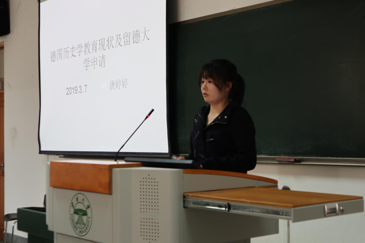 2019年3月7日15:30,德国波恩大学在读博士唐婷婷于新葡萄88805官网东陆校区文渊楼406教室为我校学生带来了题为“德国历史学教育现状及留德大学申请”的讲座,大约有50多名师生参加了这次讲座,本次讲座由新葡萄官网AMG钱金飞教授主持。
